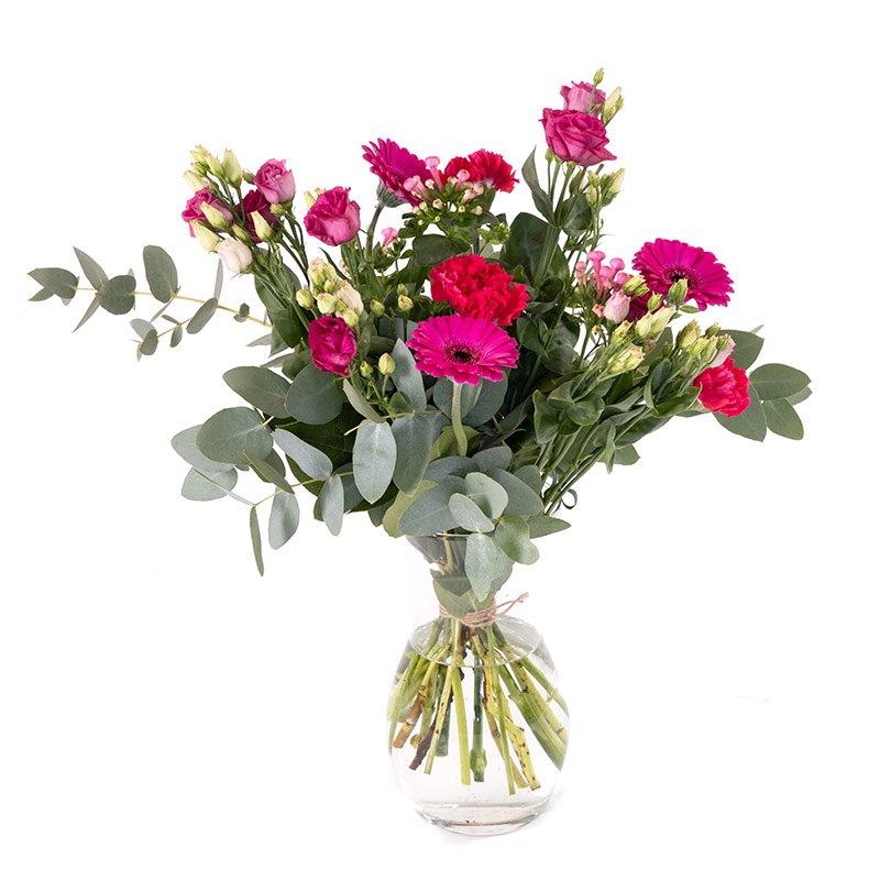 Nowoczesny, przestrzenny bukiet będący piękną mieszanką różnych odcieni różu, beżów i pasteli. Składa się z jasno- i ciemnoróżowych kwiatów, takich jak goździki, gerbery, róże, eustomy i inne, emanując energią i świeżością. Podkreślony lekkimi pastelowymi akcentami i uzupełniony zielonymi dodatkami, takimi jak gałązki eukaliptusa, ten bukiet jest świetną niespodzianką dostępną na każdy budżet.