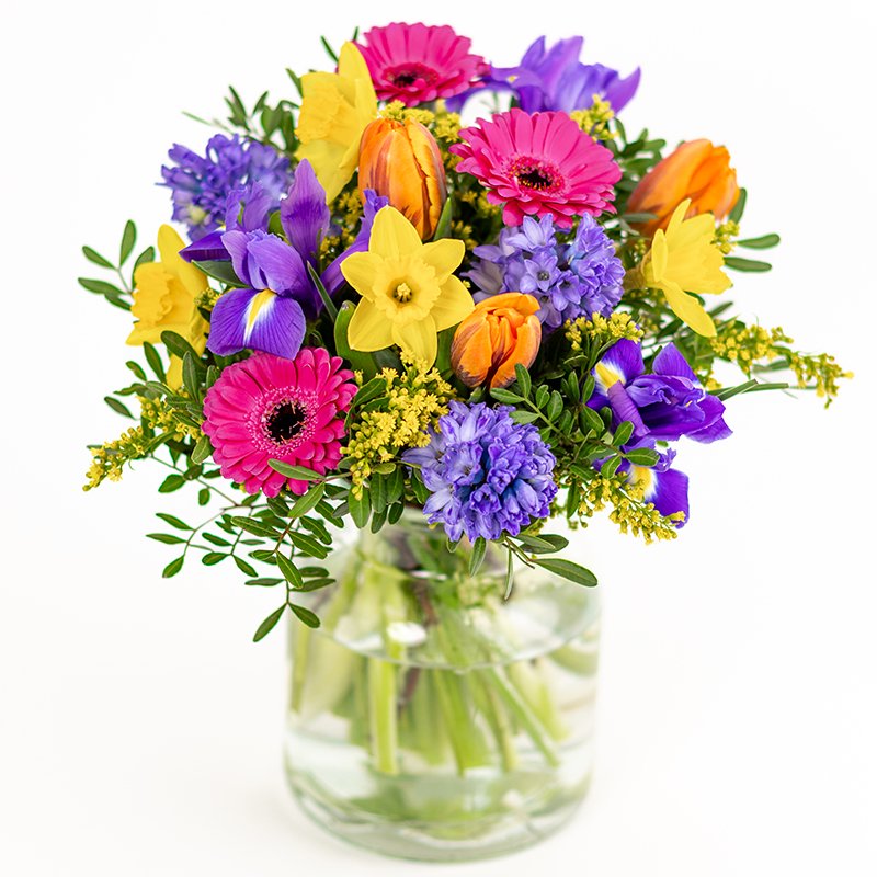Ten radosny bukiet to prawdziwa eksplozja wiosennej energii! Bukiet "Tęczowa Wiosna" to pełen życia bukiet zachwyca różnorodnością barw – znajdziesz w nim kwiaty takie jak fioletowe hiacynty, fuksjowe gerbery, żółte żonkile, głębokie fioletowe irysy i pomarańczowe tulipany. To radosna, dynamiczna, wiosenna i wielkanocna kompozycja, która od razu poprawia nastrój.